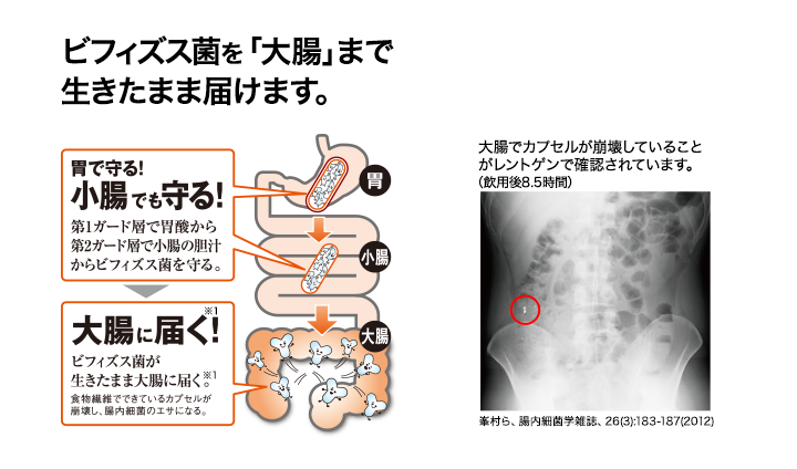 日清ファルマが独自開発した特許取得の「大腸デリバリーカプセル」は、胃酸や小腸の胆汁からデリケートなビフィズス菌を守り、大腸にたどり着いてカプセルが崩壊し、ビフィズス菌が生きたまま広がる仕組み。ビフィズス菌が大腸で善玉菌として活動します。