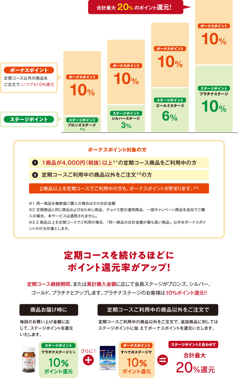 定期コースご利用中の商品以外に追加でご注文頂いた商品にはステージポイントに加えてさらに10%ポイントを還元します。ステージポイントとあわせて最大20%ポイントを還元いたします。(プラチナ会員様の場合)