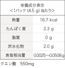 | 原材料名 | 小麦グルテン加水分解物(WGH)(国内製造)、ぶどう糖/クエン酸、糊料(プルラン)、香料、甘味料(スクラロース) |