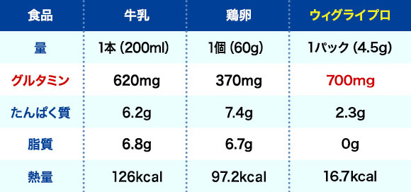 日清ファルマ「ウィグライプロ」は、1パックあたりのグルタミン含有量が700mg。これは他の食材よりも断然多い含有量。さらに、ペプチド状で吸収しやすく、カラダにしっかり届きます。